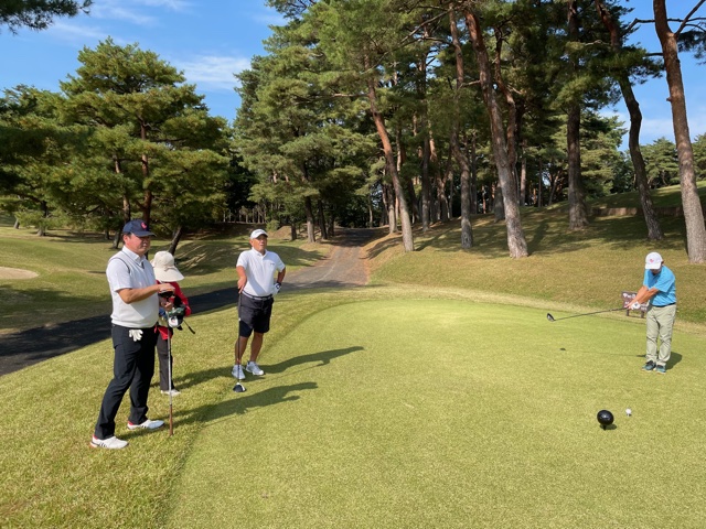 その後、お世話になる東京都の縁のH.Tさんがお越しに。6時50分に受付をし、着替えて4人でレストランへ。ハムエッグをいただき、少々パター練習。今日はAグリーンの黒ティから。東から。