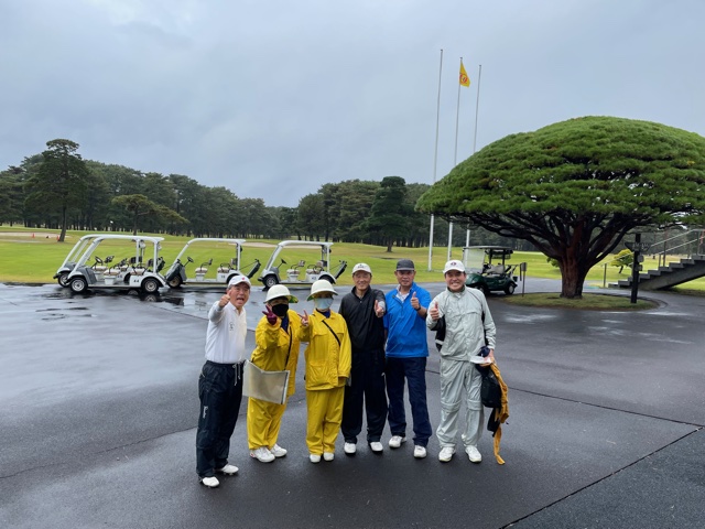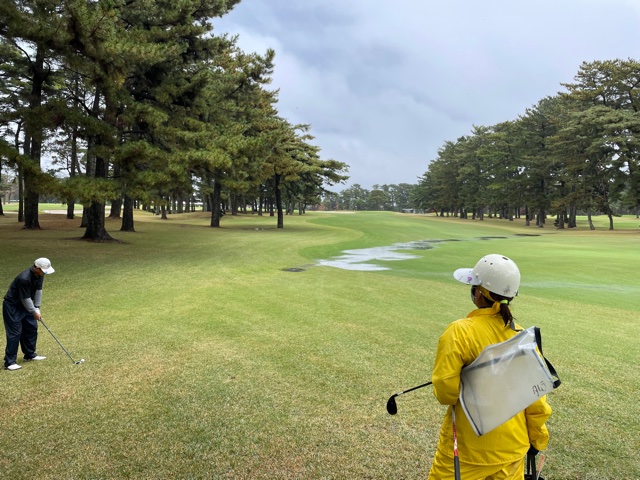 合羽を着て、今日は東を廻ります。グリーンはホワイト、ティは青ティを使用します。アウトから。今日はキャディさんが2名付いて下さいます。