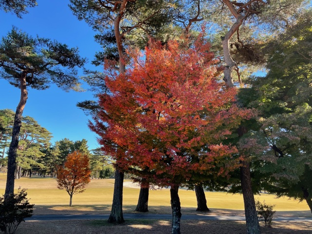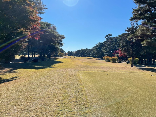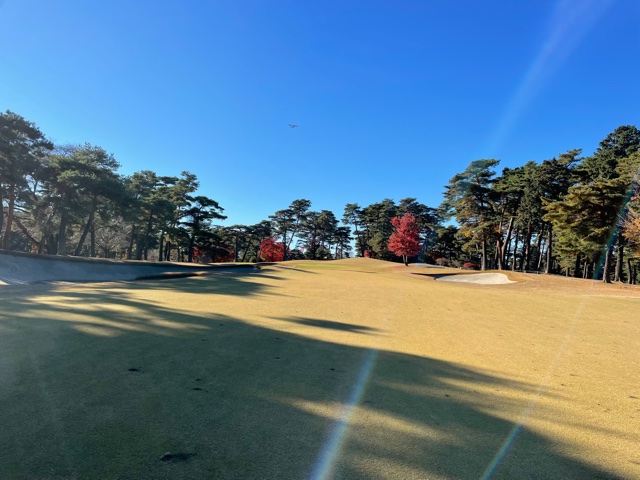 6番557yロングは、ドライバーは追い風でまずまず飛んだ。3uで残り115yへ。PWで手前10mに3オン。無難にパー。このホールは全員3オンから無難にパー。