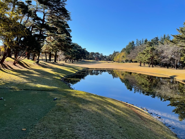 18番右ドッグの436yミドルは、ドライバーは左ラフへ。届かいので安全に左へ打とうと3uで打つもスライスし、最後に池にジャブン。ドロップして4オン。ダボ。ナイスアプからS.Mさんが無難にパー。