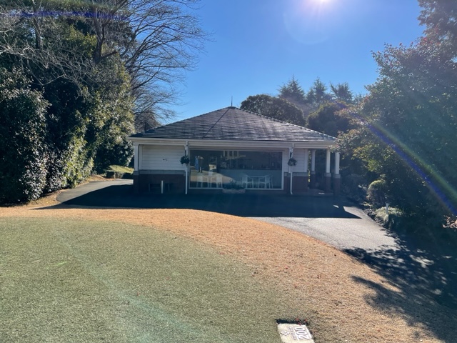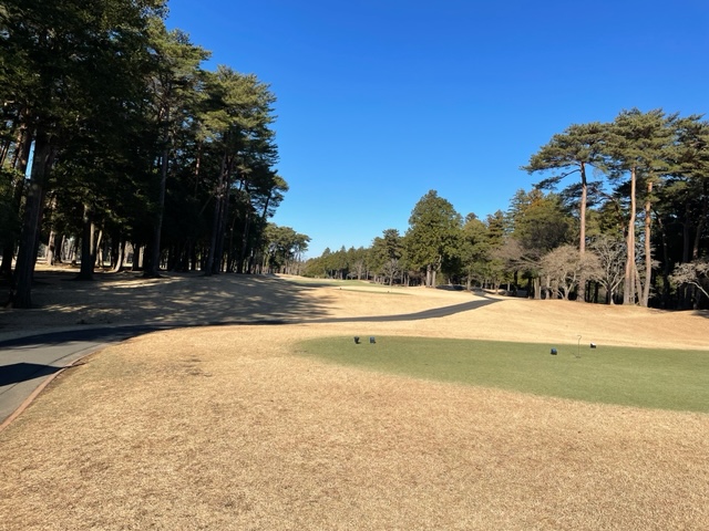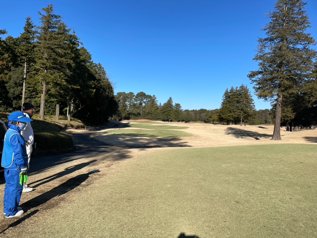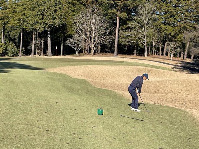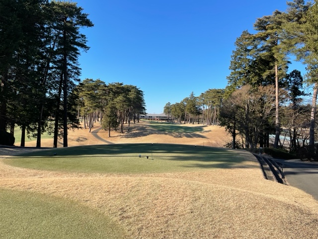 16番335y左ドッグのミドルは、ドライバーは右ラフへ。残り85yから56度で打つもカーン。奥へ。アプがショボ。入らずボギー。見事な2オンからK.Oさんが無難にパー。