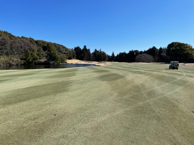 13番右ドッグの477yロングは、ドライバーはまずまず。25度のuで残り80y付近へ。ライの悪い位置から52度で5mに3オン。決められず。同じく3オンからメルウェイが無難にアルミパー。