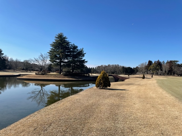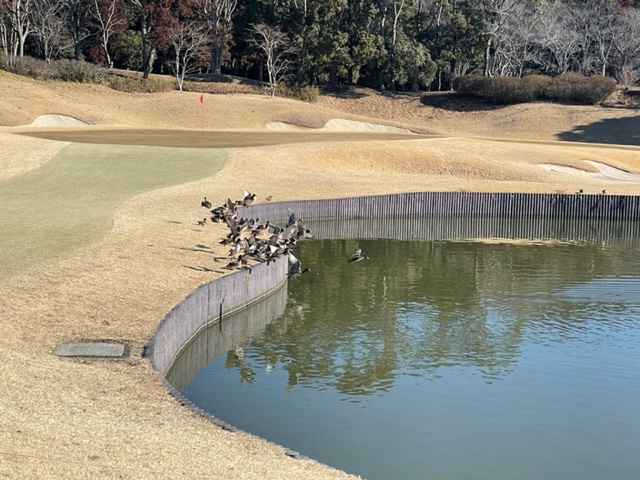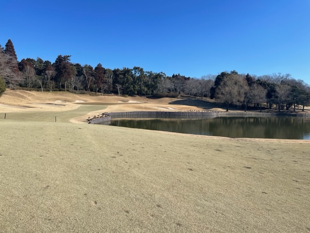 7番425y池越えで右ドッグのミドルは、ドライバーは辛うじて池を越える。3wで奥のカラーへ。パターで寄せて鉄パーベスト。初得点だよ~。