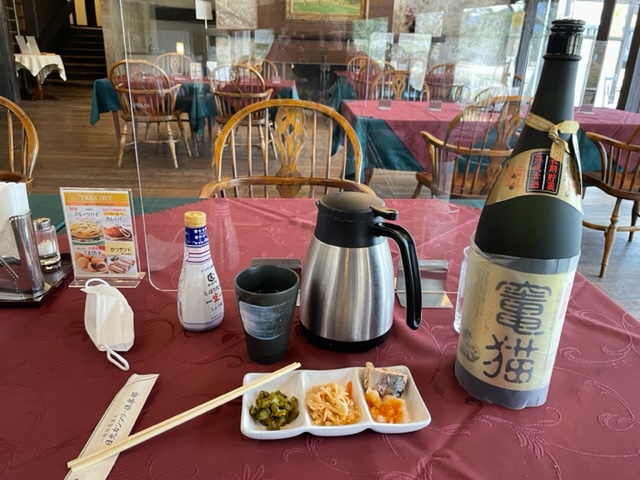 今日はベーコンエッグと芋焼酎竃猫と少々のつまみが朝食です。ここは最高です。