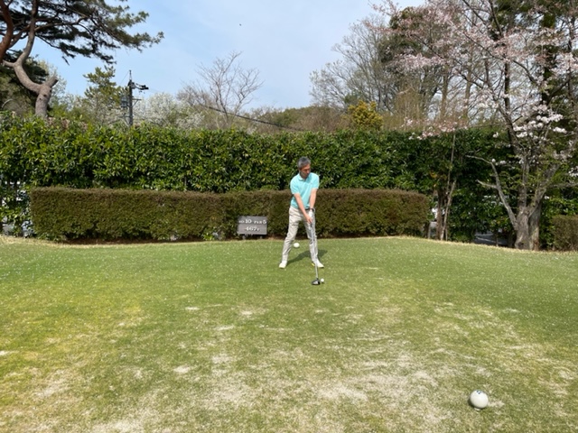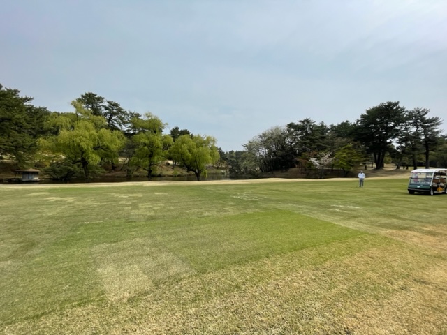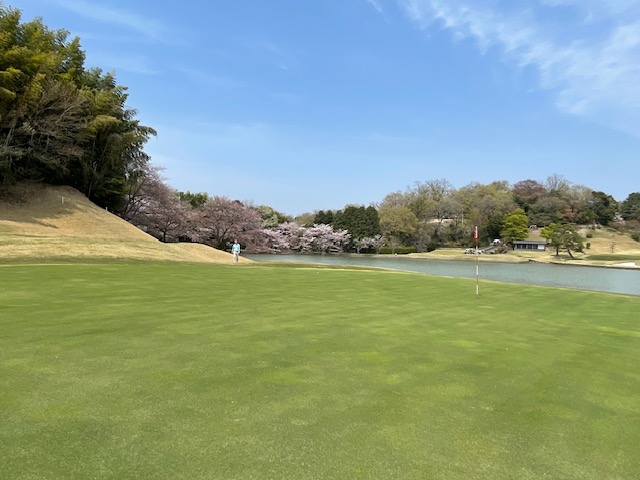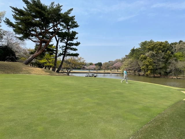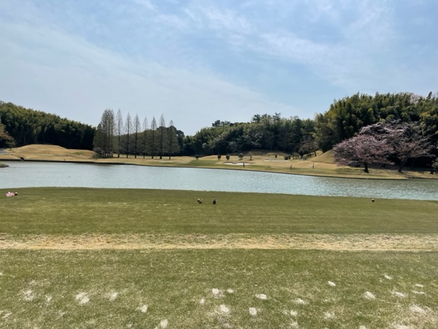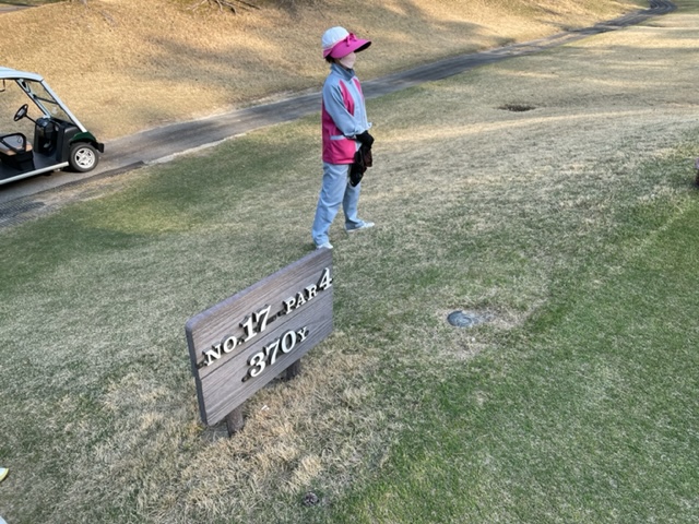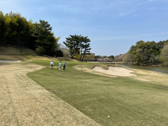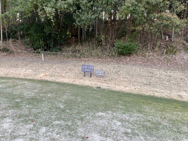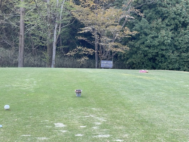 15番342yミドルは、ドライバーはまずまず。残り125y追い風をPWで打つもショート。カラーからパターで3パンチダボ。痛いミス。S.MさんとJ.Oさんが2オンから無難にパー。