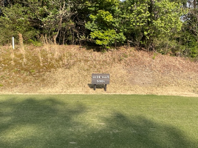 14番来ましたアパッチ砦の530y右ドッグのロングは、ドライバーはまずまず。3uで残り115y上りへ。9アイアンで7mに3オン。無難にパー。