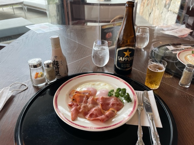 レストランに行きますと、千葉県のS.Yさんがすでに到着されておられました。合流し、ベーコンエッグを食しながら、サッポロで乾杯。そこに、東京都のH.FさんとT.Fさんが合流し、4者談義です。