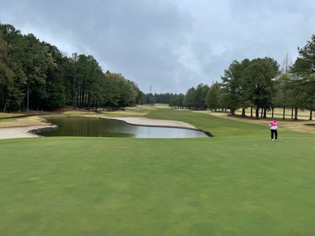 17番397yミドルは、ドライバーはナイス。それでも距離が残っています。池もあるので方向性が大事です。3uで打つもショート。アプは奥のカラーへ。ここから放り込んでナイスパー。