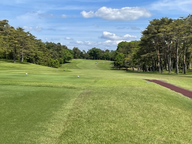 いざ、アウトから。来週の女子プロトーナメントの準備が着々と進んでいます。今日はグリーンはNEW、ティは青ティで進行します。ほぼ女子プロのティとなりますでしょうか。今日はキャディが2名と贅沢です。