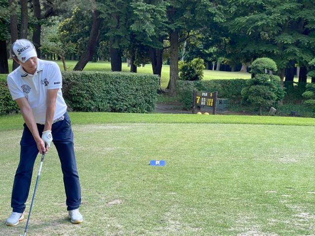7番166yショートは、6アイアンでピン左6mに1オン。無難にパー。同じく1オンのR.Sさんも無難にパー。