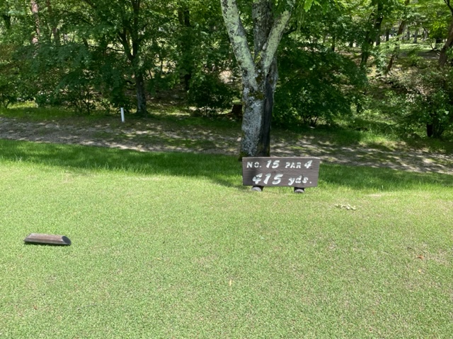 15番415yミドルは、ドライバーはまずまず。5アイアンで打つも右へ。なんとか寄せて銅ベス獲得。