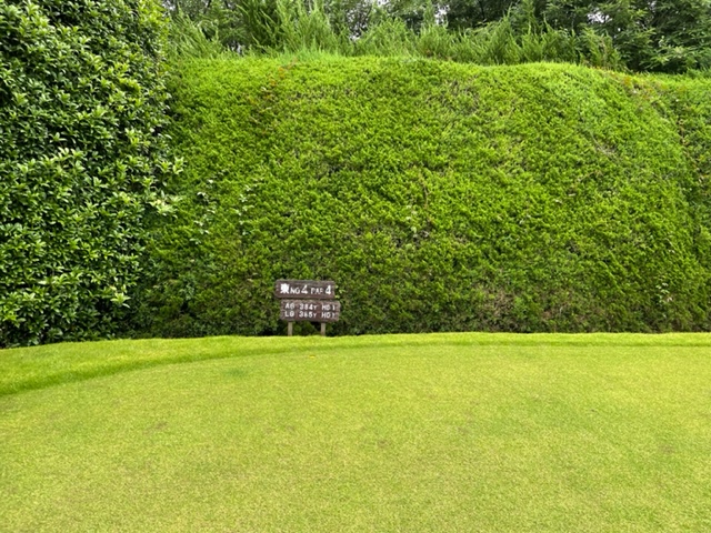 3番410yミドルは、ドライバーは左ラフへ。6アイアンで打つもショート。寄らず入らず。