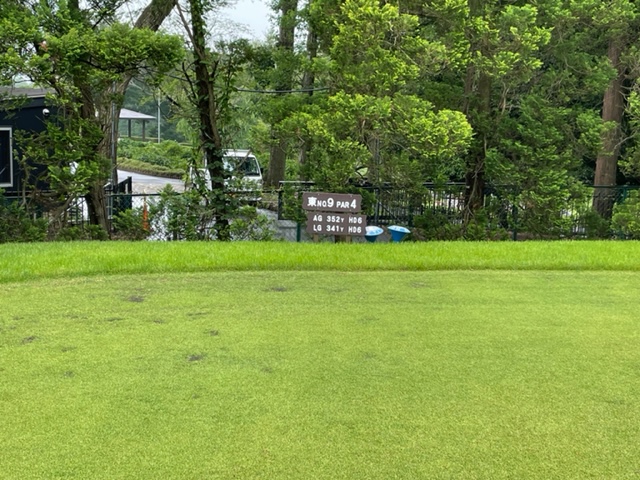 9番368yミドルは、ドライバーは左ラフへ。PWで打つもちょいとショート。なんとか寄せて銅パー。ここも素晴らしいパッティングでM.Tさんが連続パー。