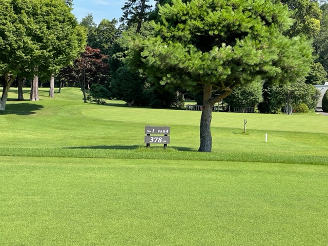 5番378yミドルは、ドライバーは左ラフへ。9アイアンで打つもショート。なんとか寄せて鉄パーベスト。1アップ。
