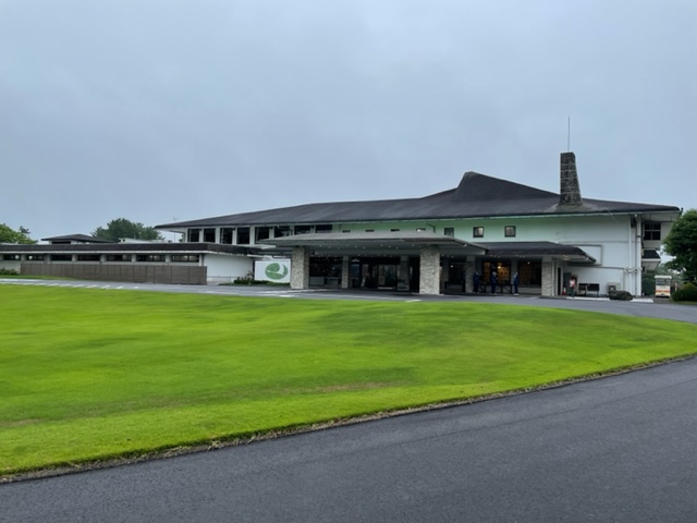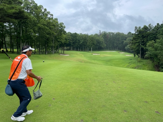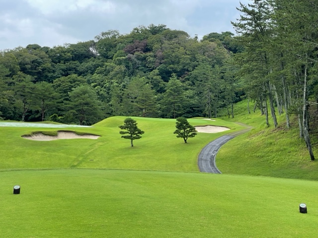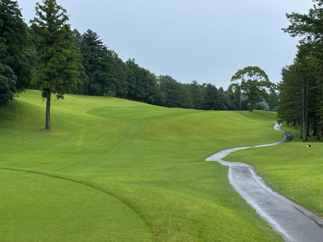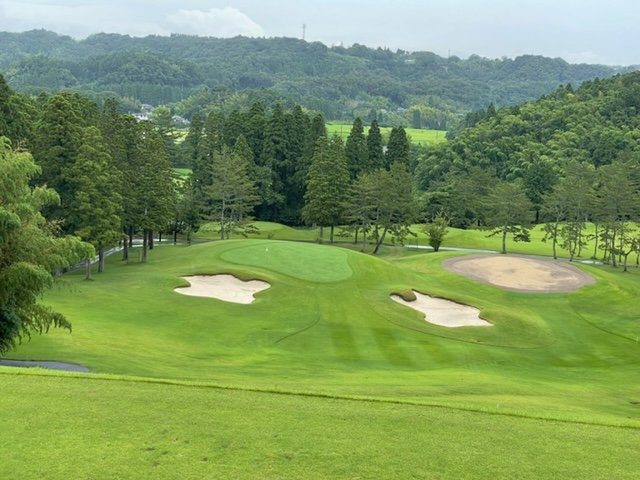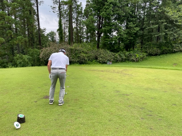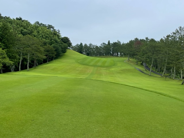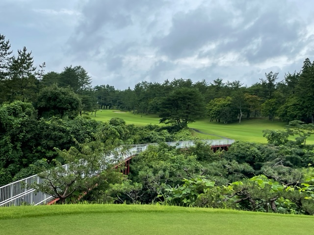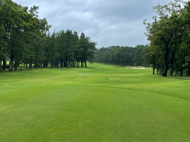 9番475y左ドッグのロングは、ドライバーは完璧ラインに出したが、距離が出ない私は木に当たる。林から8アイアンで転がして残り220y地点へ。6アイアンでレイアップ。56度で1ピンに。が、入らない。ボギー。