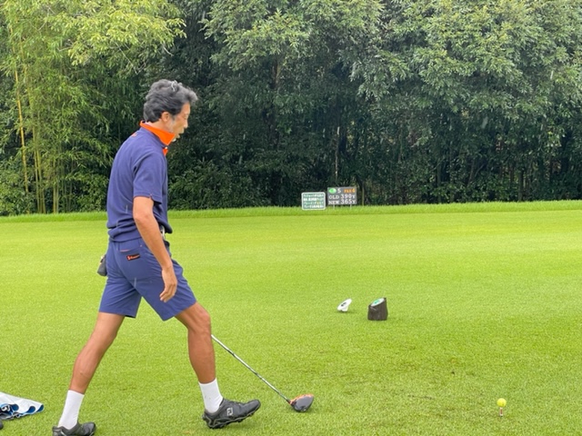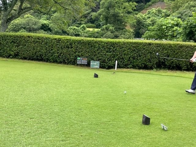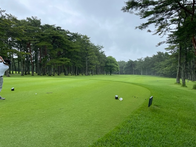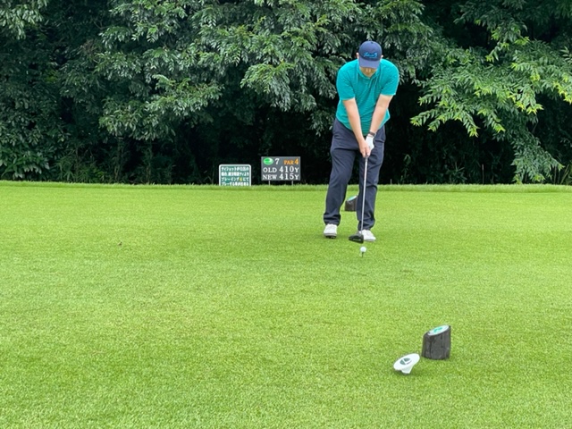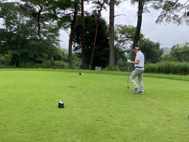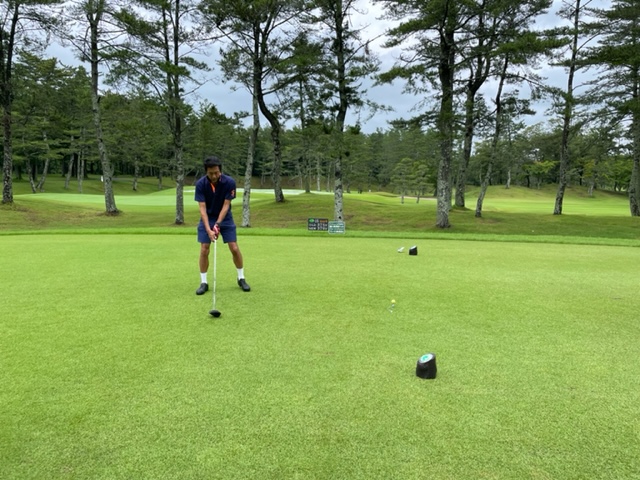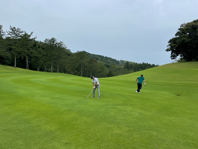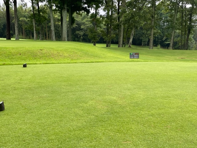 その後、パターを転がして、西インから。今日はニューグリーンで白ティから進行します。今日は小松支配人と東京都のK.YさんとNさんです。