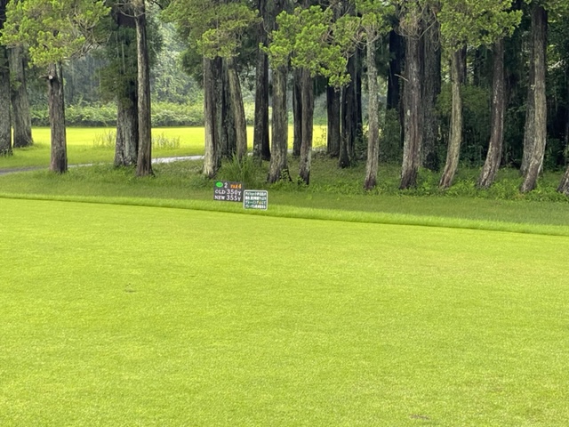 8番355yミドルは、ドライバーをスライス狙いで打つも逆球。木に当たりセーフ。8アイアンで打つも右へ。これまたナイス56度での転がしでパー。
