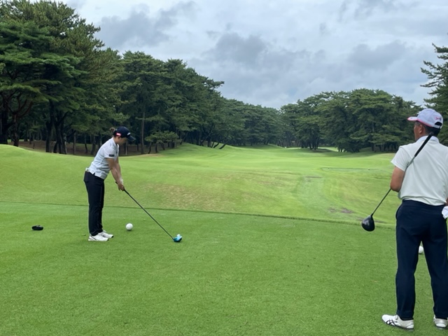 インから。今日は今年の女子プロテスト最終会場の大洗でプレーをしておきたいというM.KさんとそのM.Kさんを応援するS.Mさんと要人S.Mさんとのラウンドです。今日はS.Mの人が3人いますね。ティイングエリアはその時使う距離のもので進行します。