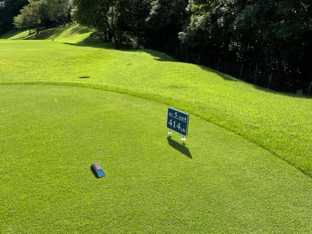 4番525y左ドッグのロングは、ドライバーは右ラフへ。3uでまずまずの位置へ。再度3uで打つも全然左へ。まずまずのアプでしたが、パターがショボ。ボギー。見事な3オンからWさんが無難にパーでベスト獲得。