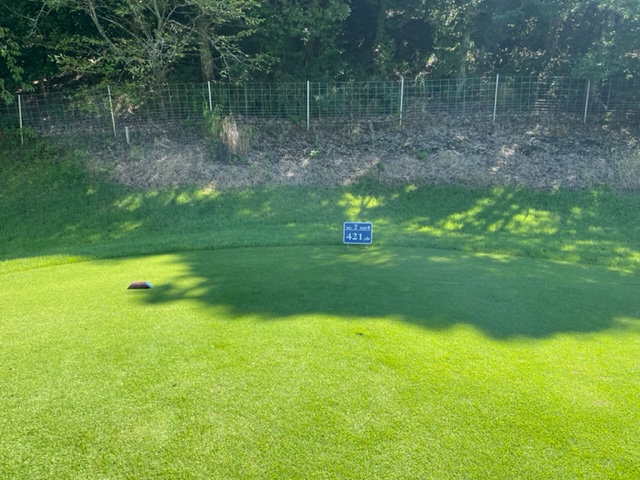 7番421yミドルは、ドライバーはナイス。3uで打つも右カートパス方向へ。ナイスアプで1.3mに寄せて、これを沈めて銀パー。3mを沈めたM.Yさんがこれも入れてナイス金パー。