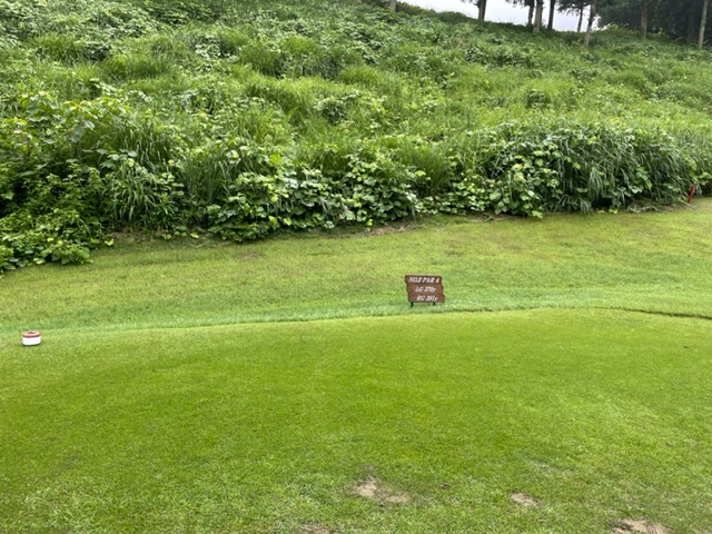9番378yミドルは、ドライバーは大きく右へ。暫定球を打つ。初球は発見できず。右ラフからの4打目を3uで打つもショート。寄らず入らず7となる。