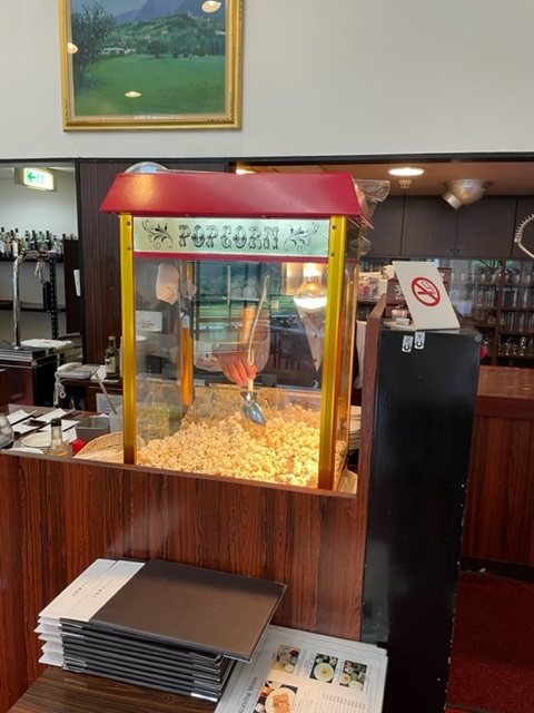 さて、ロッジで朝風呂にも入り、さっぱりして受付後、レストランへ。日帰り組の埼玉県の縁のS.Mさんも合流され、4者ミーティングです。ここでの私は豚汁とポップコーンであります。ゴルフ場にポップコーンの作成機があるのってそうないよね~。素晴らしい。が、冷たいのがいかんわ(笑)。