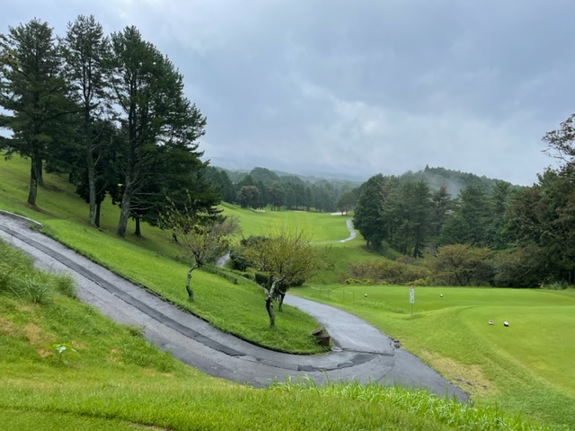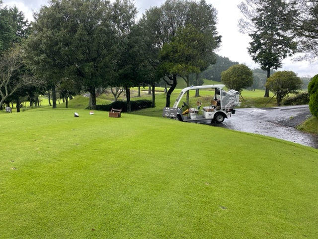 すごい雨が降ってきた。しばし、カートで休憩。で。10分後止む。