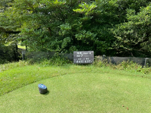 7番603yロングは、ドライバーは竜巻球。暫定球を打つ。かろうじてセーフ。チョン出し。6アイアン、6アイアンで右へ。なんとか寄せてナイスボギー。