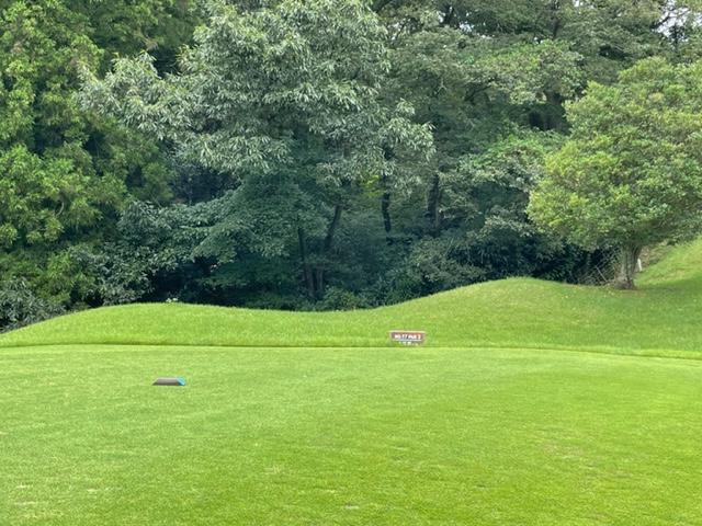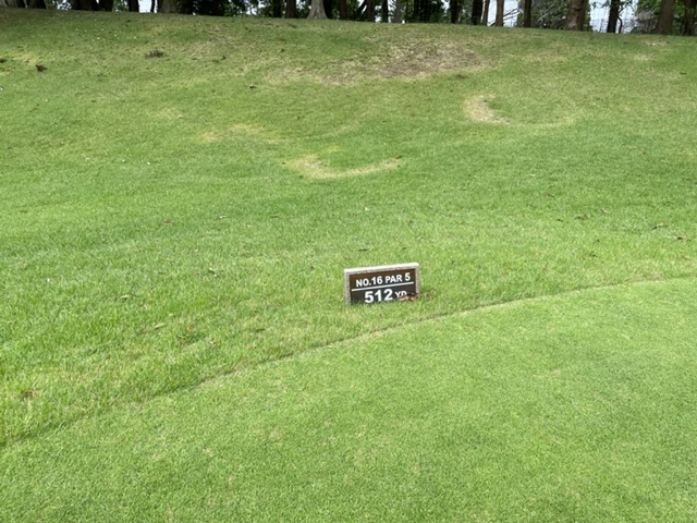 16番512yロングは、ドライバーは右ラフへ。傾斜がきつくて8アイアンで打つ。あまり飛ばず。3打目を5アイアンで打つもバンカーイン。寄らず入らず。見事な3オンからT.Oさんが無難にパー。