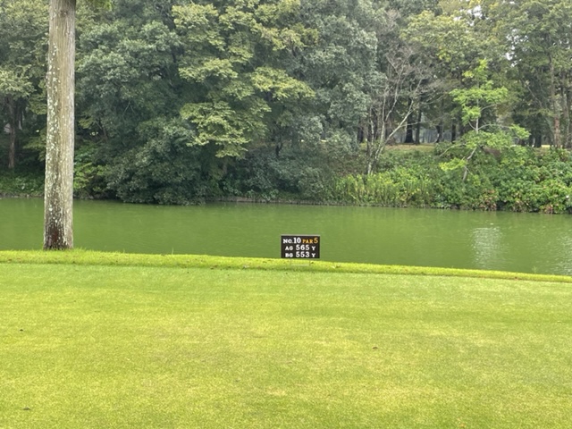 10番553y左ドッグのロングは、ドライバーは竜巻球。6アイアンで前方へ。残り220yから3wで打つも左へ。あまり寄らず。も、パターが入りナイスパー。ここを簡単に3オンさせて、M.Hさんが無難にパー。