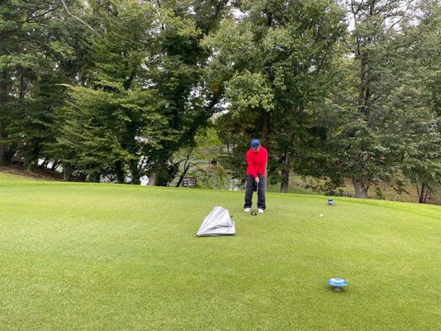 9番354y右ドッグのミドルは、ドライバーは右ラフへ。カートパスは足場が掛かってもドロップだそうな。ヒェー。右にドロップ。8アイアンでの転がしが左ラフへ。なんとか寄せてパー。同じくナイスアプからH.Cさんもパー。8連続パーの37回。素晴らしいプレーでした。