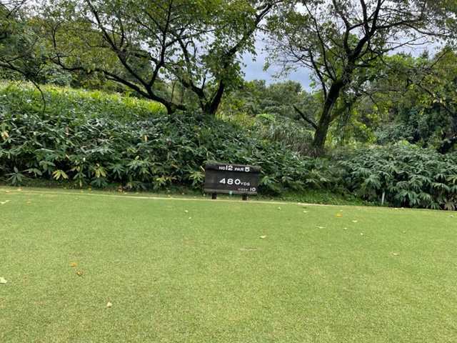 12番480yロングは、ドライバーはこれまた左へ。クロスバンカーイン。6アイアンで脱出。雨が降ってきた。3打目はショート。も、ナイスアプでパー。見事な3オンからK.Fさんも無難にパー。