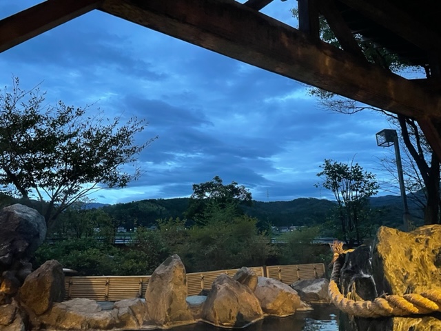雨が降ったり止んだりで少し冷えた体をお風呂で温める。お風呂は狭山のように熱め、温めの2つの浴槽があり、なかなか快適。