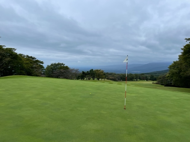 18番464y打ち下ろしミドルは、ドライバーは傾斜に当たりぶっ飛び。残り155yから8アイアンで奥10mに2オン。が、ここからアホの3パンチ。