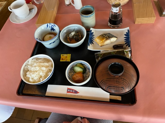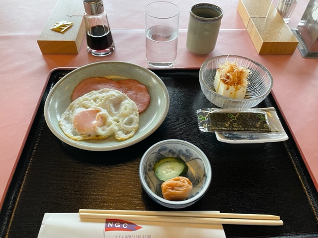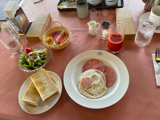 7時から3人で朝食タイム。今日もハムエッグ和膳を食す。お二方の朝食も掲載します。