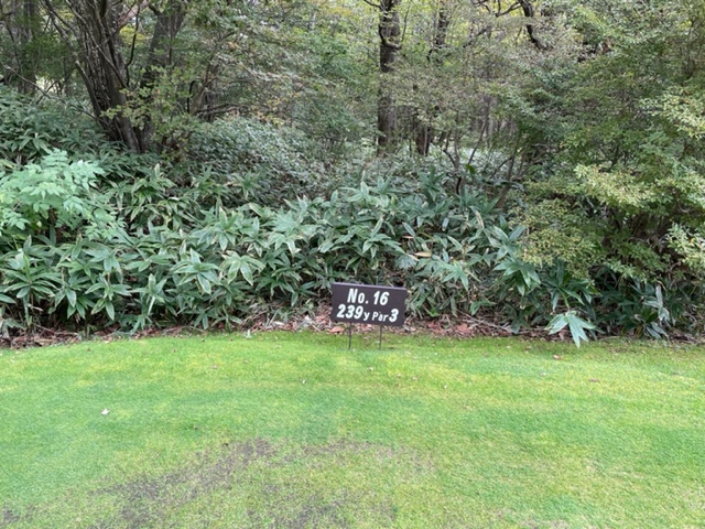 16番239y打ち下ろしショートは、3uで打つも右に飛んで木に当たる。2打目が乗らず。ダボ。