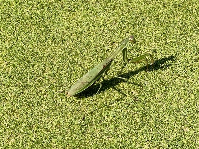 7番352yミドルは、ドライバーはスライスが掛かりすぎて右ラフというか林の間。幸い上を狙えそうでSWで奥7mに2オン。無難にパー。