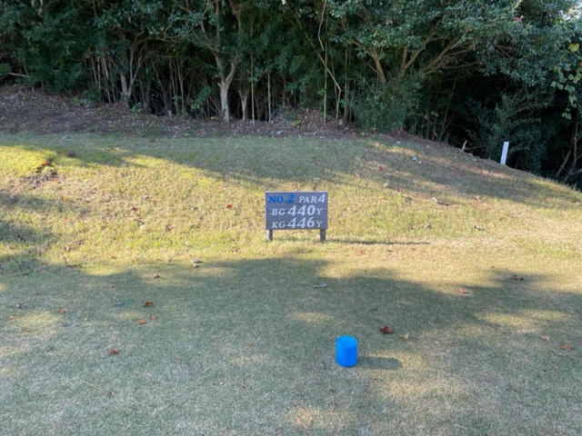 1番479yロングは、ドライバーは竜巻球。PWで木越えを敢行しましたが、あまりゲインせず。8アイアンで打つもショート。寄らず入らず。