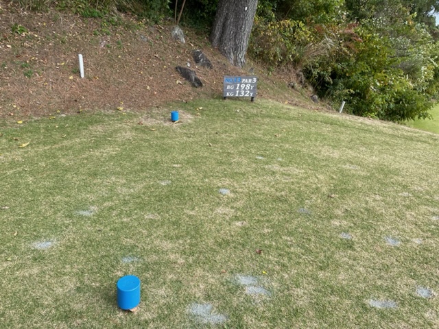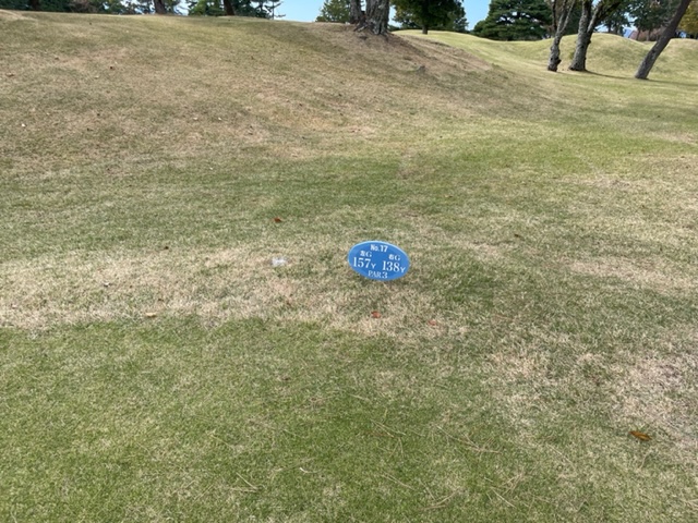 17番139y打ち下ろしショートは、9アイアンで打つもペシャ球。寄らず入らず。