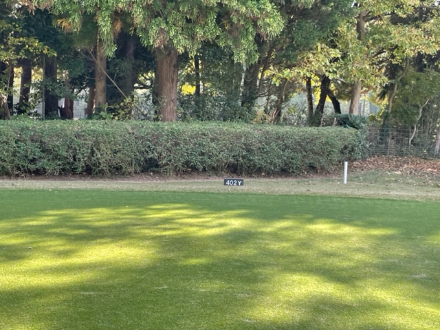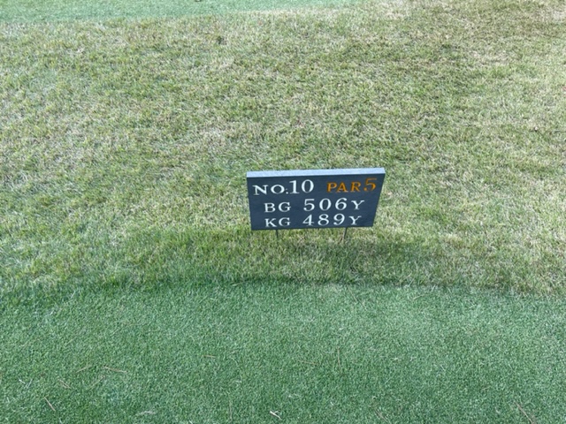 10番506yロングは、ドライバーはまずまず。3wがチョロ気味。8アイアンで6mに3オン。放り込んでバーディ。ラッキー。見事な3オンからA.Iさんが無難にパー。