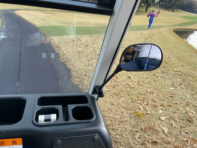 さて、スタートします。青ティで進行します。なんと、カートにミラーが付いています。インから。