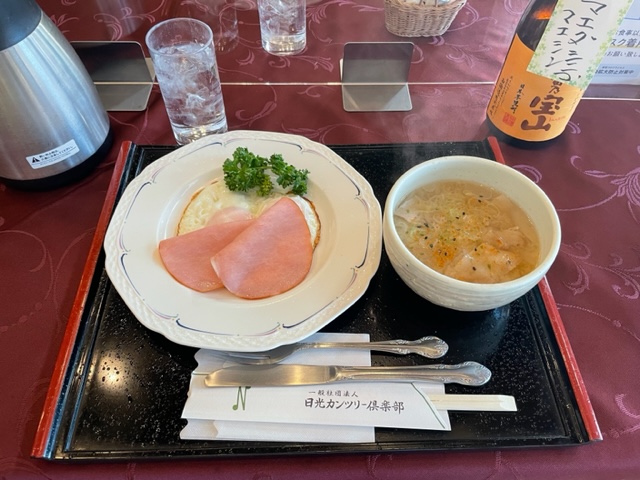 ハムエッグと豚汁をいただきます。
