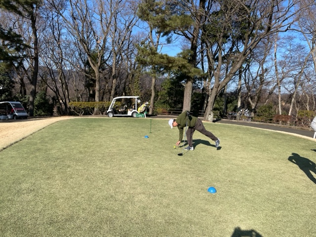 10番158yショートは、7アイアンで打つも左へ。寄らず入らず。8mに1オンのプロが無難にパーでニアピンベスト獲得。