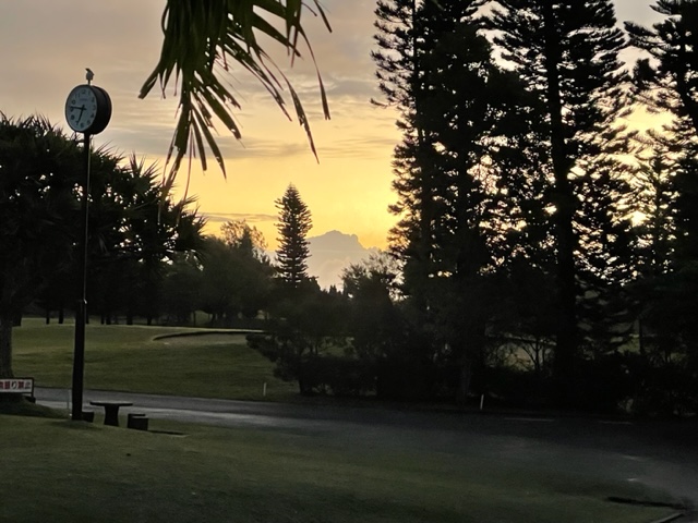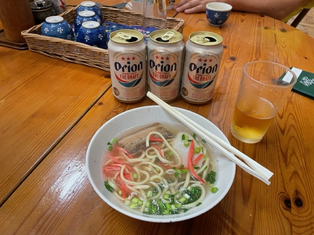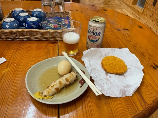 今日は沖縄シリーズ最終日です。今日もスタートは7時半前なので、6時半に到着し、着替えて、今日はスタート小屋の茶店に。ここでオリオンビールとおでんとハムカツと沖縄そばを食す。実に最高です。