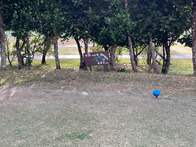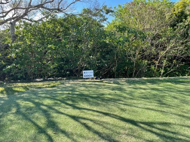 9番536yロングは、ドライバーは左ラフへ。5アイアンで打つも全然飛ばず。ラフに入ると全然飛ばせられない。残り195yからの4アイアンがどショボ。寄らず入らず。しっかり3オンのS.Mさんが無難にパー。