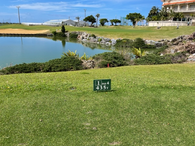 1番435yミドルは、ドライバーはまずまず。4アイアンでセカンドは竜巻球。ナイスアプで2mに寄せたが、パターがショボでボギー。も、プロがまさかの3パンチで1アップ。