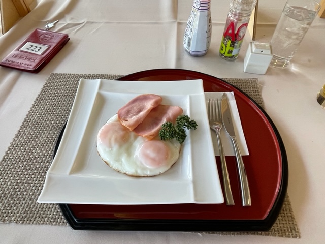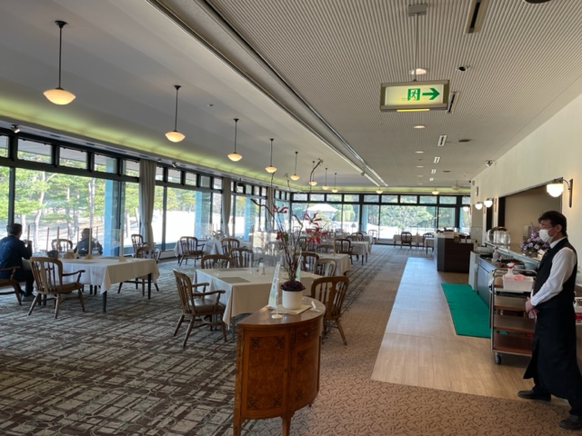 O副支配人にご挨拶し、急いでロッカーに向かい、着替えて、2階レストランに向かいます。レストランではおはようございます!との元気な声がスタッフさんから。朝から気持ちが良いですねー。で、主役の電車でお越しの東京都の縁のT.Tさんのテーブルへ。