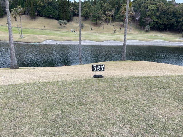 17番373yミドルは、ドライバーは右の池を避けて安全に左ラフへ。6アイアンで打つもバンカーイン。出ず。4オンのダボ。