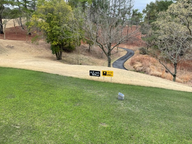 9番504yロングは、ドライバーは左のフェアウェイへ。5アイアンでフックを打とうとしたが木に当たる。3打目を再び5アイアンで打つ。で、残り180yから3uで打つも乗らず。5オンの7となる。見事な3オンからN.Yさんが無難にパー。