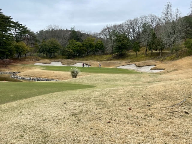 9番341yミドルは、ドライバーは左のバンカーを越える。PWでのセカンドは左のカラーへ。パターで打つも2mオーバー。入らずボギー。バンカーからナイス2オンのN.Yさんが無難にパー。
